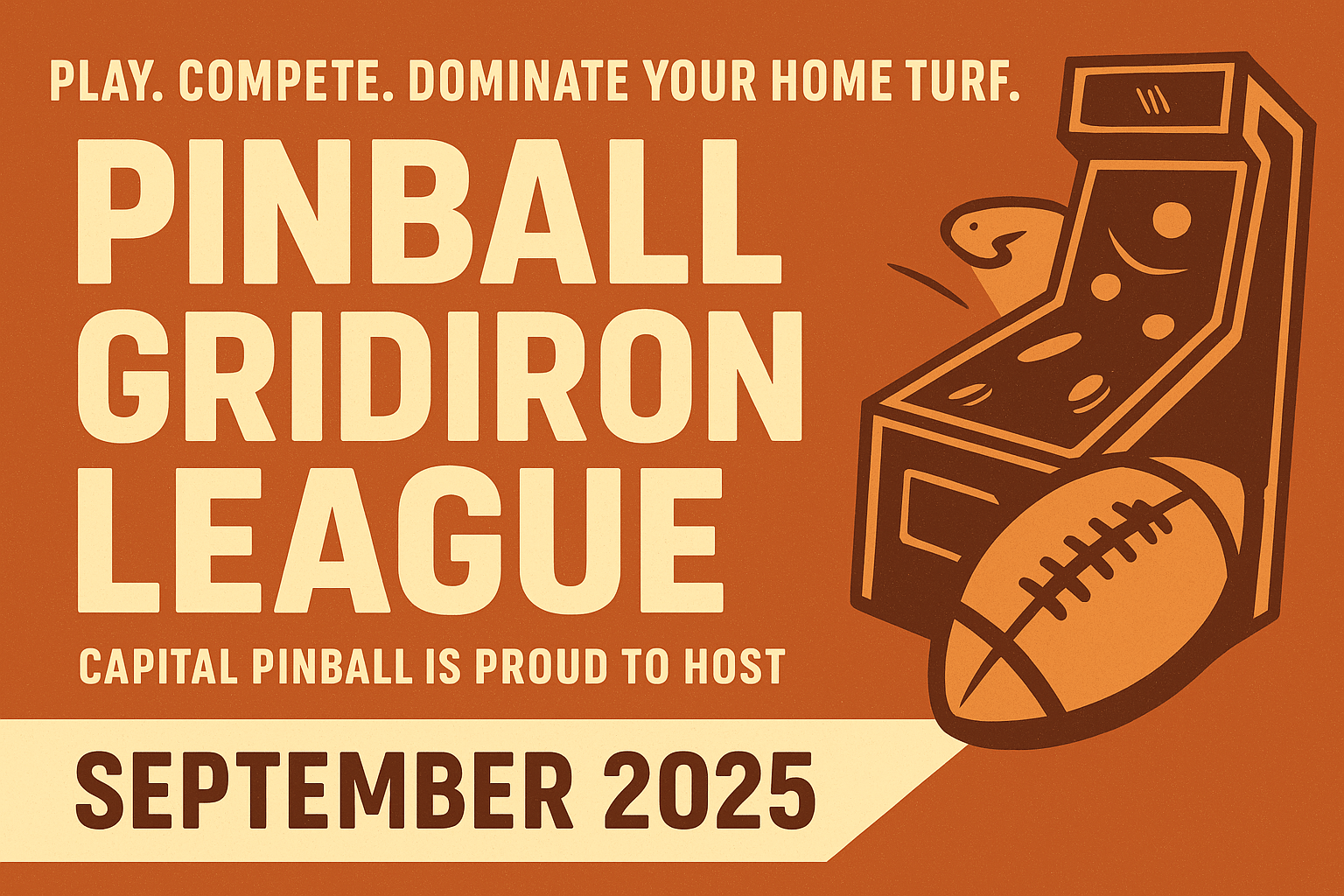 Get ready for another exciting night of head-to-head action in the Pinball Gridiron League at Capital Pinball! This football-themed pinball league runs all season long, with each player defending their own "home stadium" and challenging others on theirs.